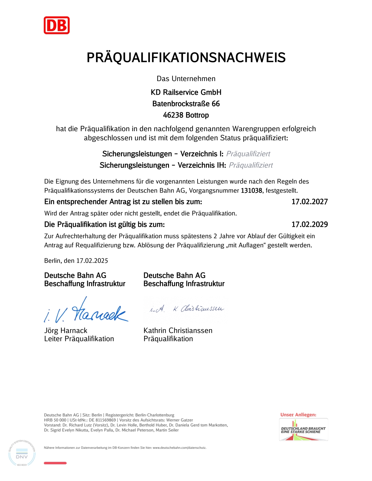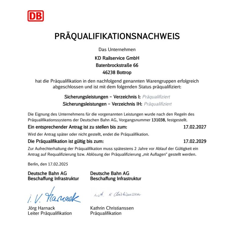Die KD Railservice GmbH ist ein spezialisiertes Dienstleistungsunternehmen mit Fokus auf Gleisbausicherung und Personalservice im Eisenbahnbereich. Von unserem Standort aus betreuen wir Projekte im gesamten Schienennetz der Deutschen Bahn AG und weiterer Eisenbahnverkehrsunternehmen.